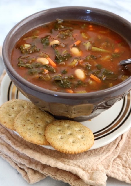 I had all the ingredients on hand to make this tasty, comforting Crockpot Vegetable & White Bean Soup. Canned foods always come to the rescue, especially during the fall and winter months. You’ll never find my pantry without canned beans, canned tomatoes, or tuna (don’t worry…there’s no tuna in this soup!). I also always keep vegetable, chicken, or beef broth or stock on hand in case of soup emergencies like this. Starting in October, I start stocking spicy vegetable juice too, since it’s a great addition to soups & chili.